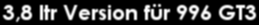 Nach dem erfolgreichen Abschluß umfangreicher Testläufe ist es soweit: Ab sofort können wir Ihnen für den 996 GT3 der 1. und 2. Serie (Straßenfahrzeuge) und den 996 GT3 Cup eine 3,8 ltr Version anbieten. So erreicht der 996 GT3 Cup Modell 2002 mit dem Umbau auf 3,8 Liter und modifizierter Sauganlage sowie der RS-Tuning-Schalldämpferanlage (inkl. Krümmer) eine Leistung von 307 kW (418PS) bei 6700 1/min. Das maximale Drehmoment von 441 Nm wird bei 5080 1/min erreicht. |